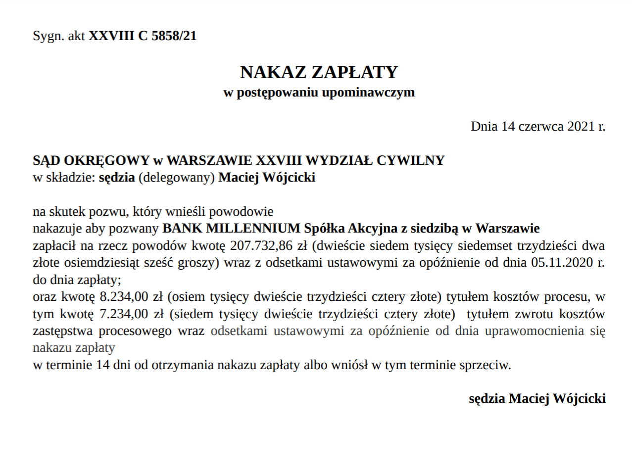 bardzo miło jest nam poinformować, że Sąd Okręgowy w Warszawie w osobie sędziego Macieja Wójcickiego, w sprawie naszych Klientów, w dn. 14 czerwca 2021 r. wydał nakaz zapłaty w postępowaniu upominawczym, w którym zobowiązał Bank Millennium S.A. do zapłaty na rzecz kredytobiorców kwoty ponad 207 tys. zł.