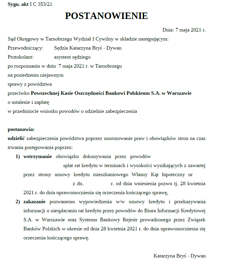Z nieukrywaną radością informujemy o uzyskaniu postanowienia o zabezpieczeniu powództwa przed Sądem Okręgowym w Tarnobrzegu w sprawie kredytu waloryzowanego kursem CHF. Sąd wstrzymał obowiązek spłaty przez kredytobiorców rat kredytu na czas trwania procesu i zakazał bankowi wypowiadania umowy kredytowej.